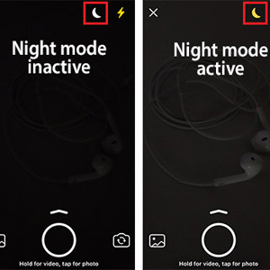 Aktif değilken beyaz renkte görünen ay işareti, Gece Modu aktif edildiğinde sarı renge dönüyor. Fotoğraf veya video çekildikten sonra bu mod otomatik olarak kapanmakta. Bir sonraki video veya fotoğraf için yeniden aktive etmeniz gerekmekte.