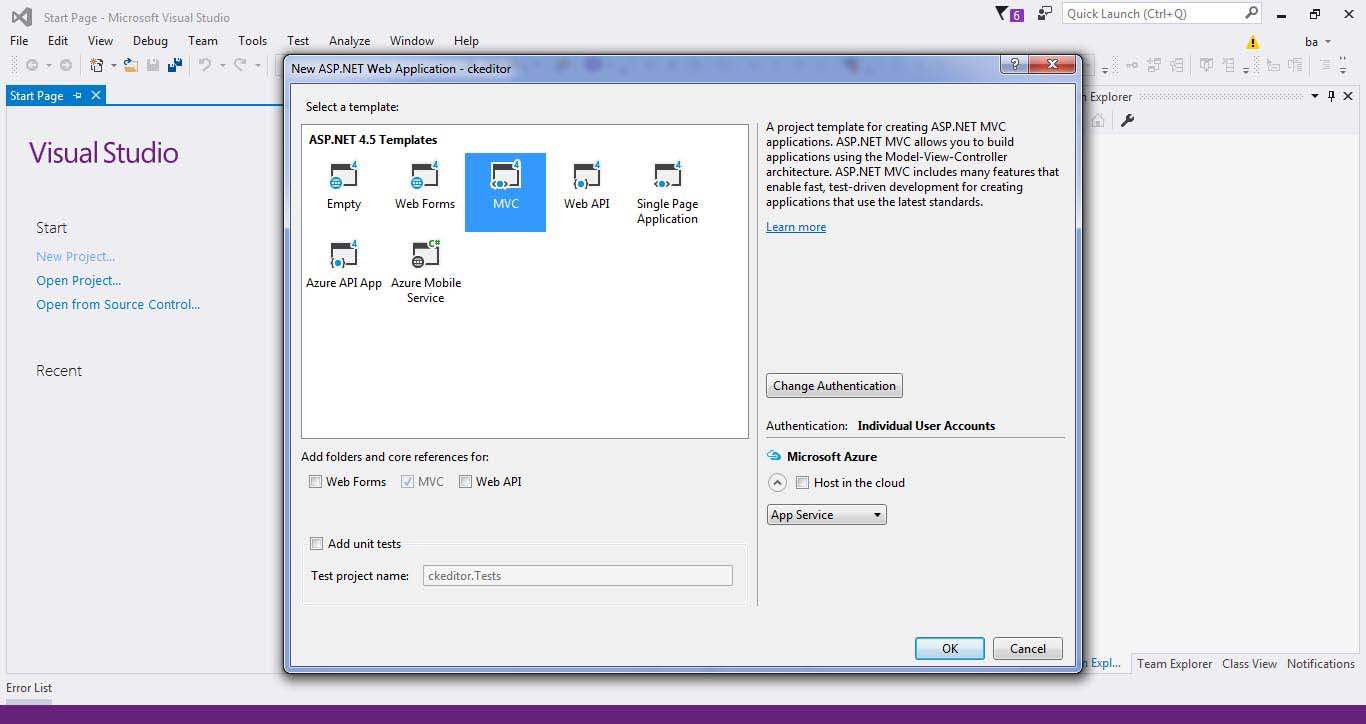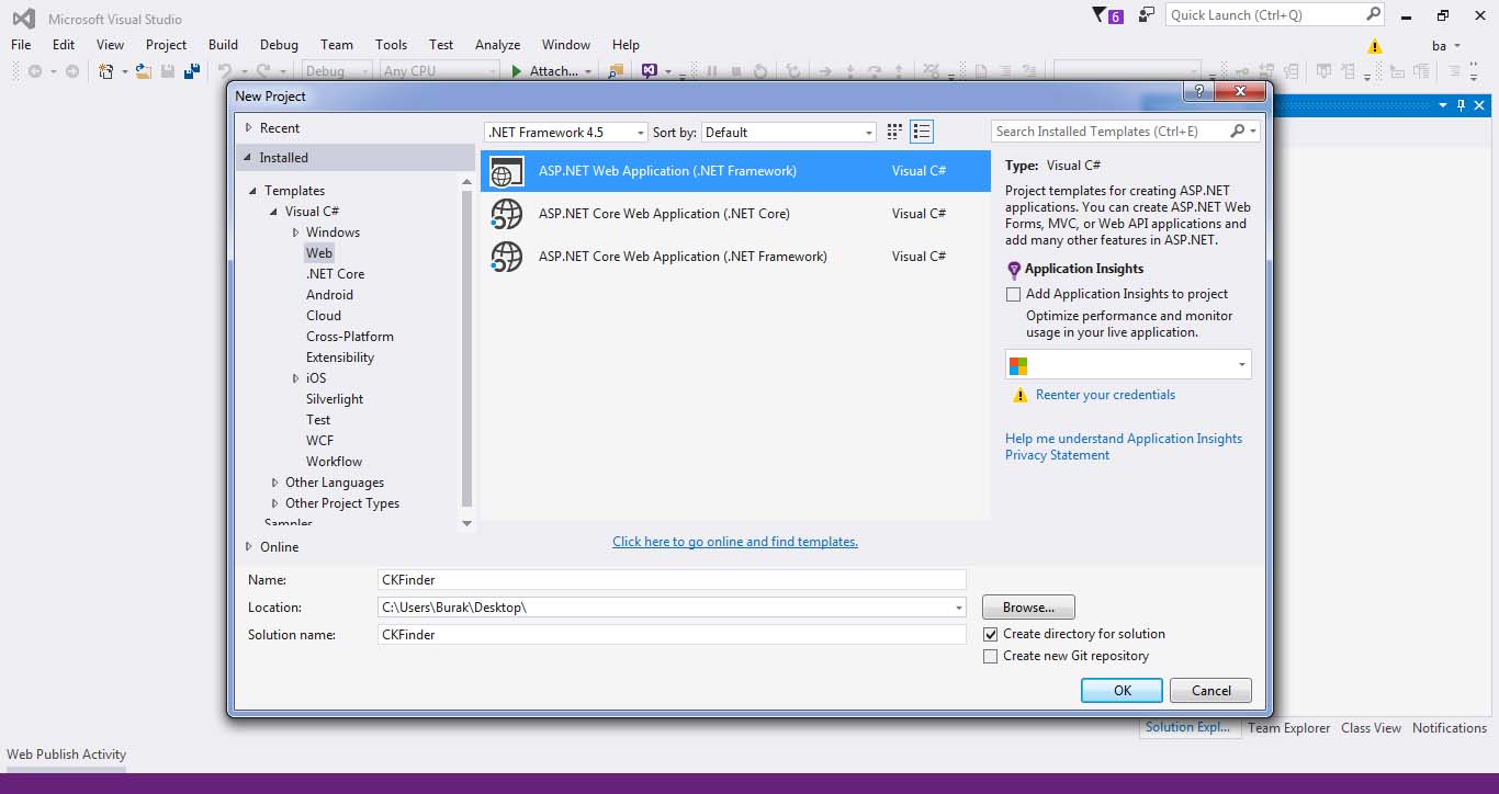 Kuruluma ilk olarak yeni bir ASP.NET projesi açarak başlıyoruz.