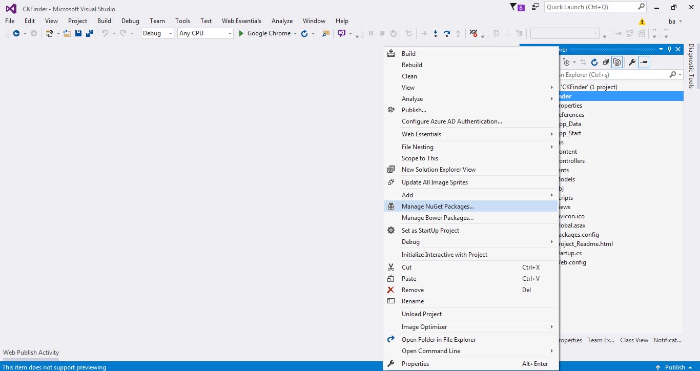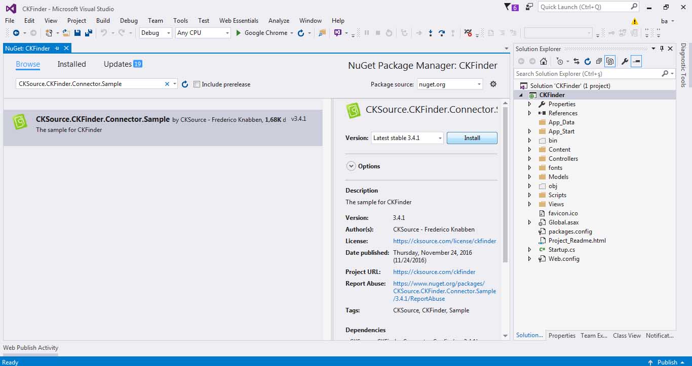 Kurulumu başarıyla gerçekleştirdikten sonra gelelim CKFinder’ı kurup aktif hale getirmeye. NuGet Package Manager > Browse sekmesine girip arama kısmına “CKSource.CKFinder.Connector.Sample” yazıyoruz ve karşımıza çıkan eklentiyi projemize ekliyoruz. CKSource taraflı yapılan güncelleme sonrasında gerekli dosyalara "CKSource.CKFinder.Connector.Core" şeklinde ulaşılmaktadır.