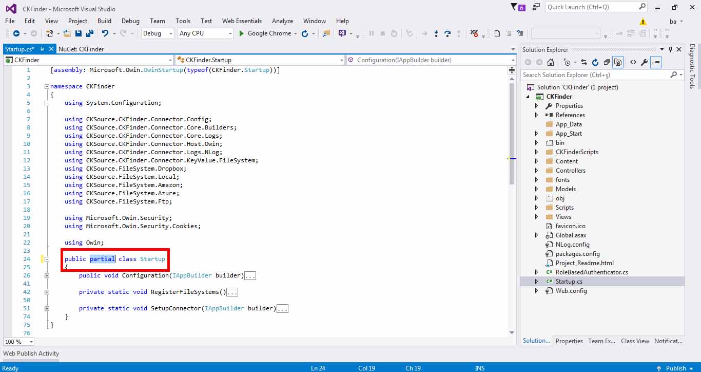 Yükleme işlemi başarıyla tamamlandıktan sonra ilk yapacağımız iş, proje içerisinde güncellenen "startup.cs" class’ına “partial” eklemek. Bunun sebebi CKFinder eklenti paketini,n class içeriğini parçalı bir yapıda düzenlemesi.
