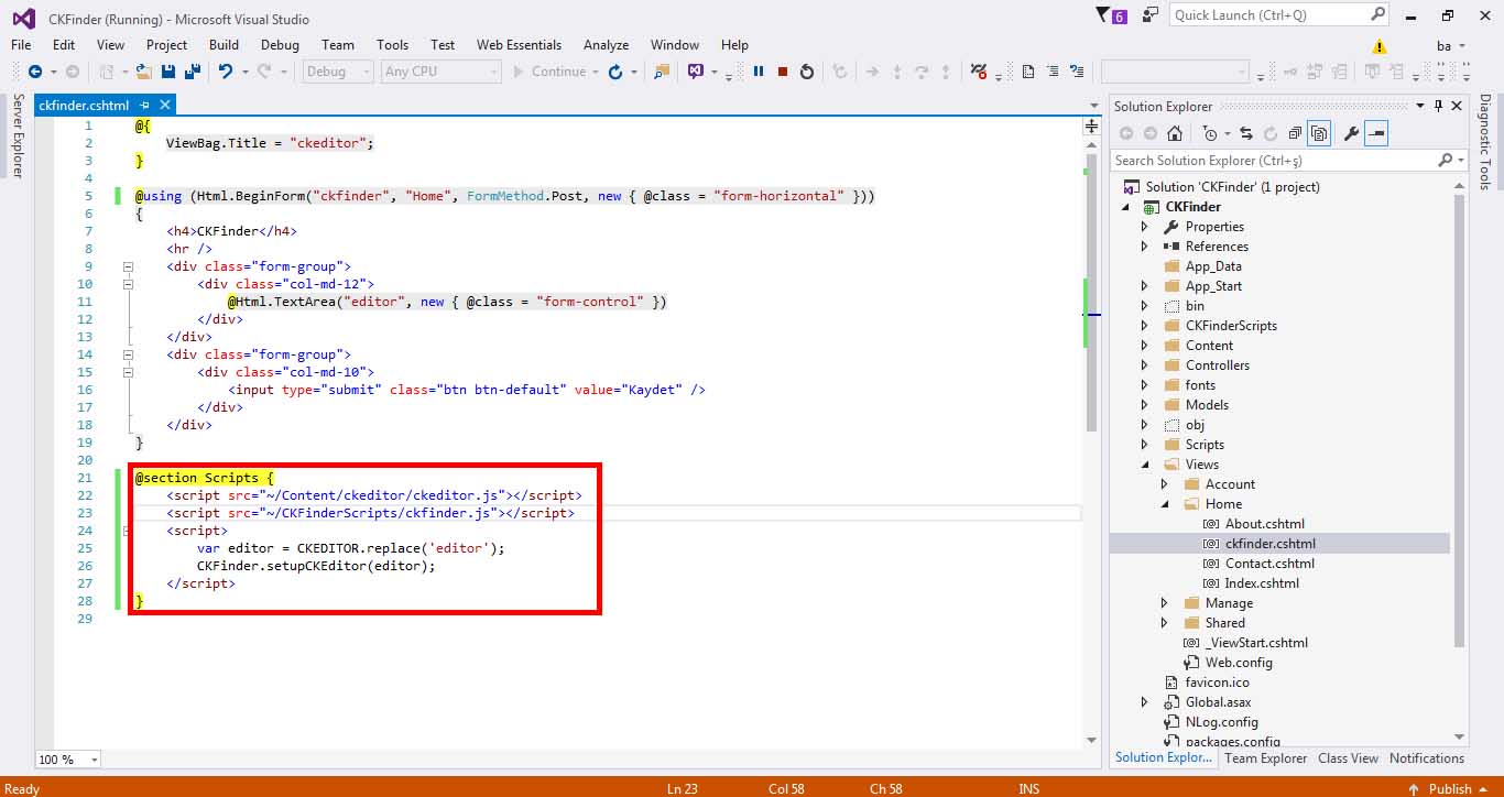 Startup.cs dosyasını güncelledikten sonra ckfinder view’ini açıyoruz ve Scripts section’unu aşağıdaki gibi güncelliyoruz.