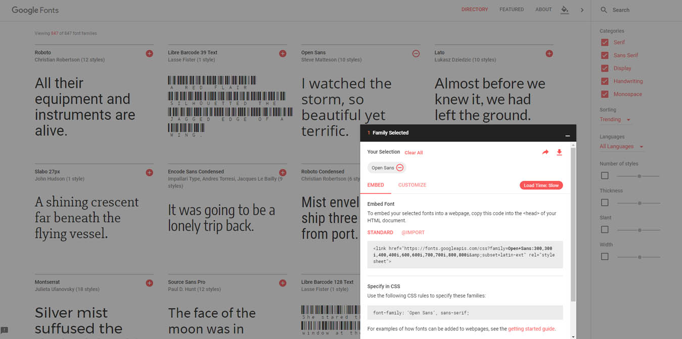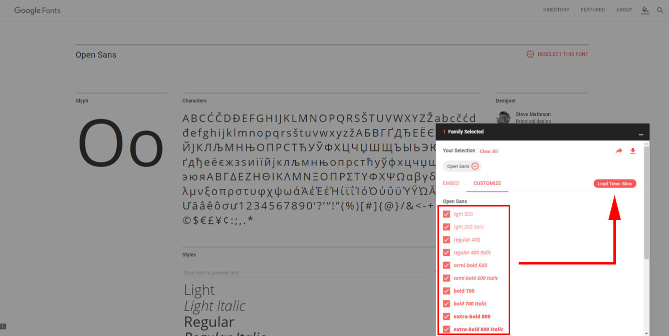 Projemizde italic, bold gibi ek özellikleri ve türkçe karakterlerde hata yaşamamak için latin extended dil paketini kullanacağımız için bunların her birini işaretlediğimizde sağ üstte “Load Time” kısmının fast > moderate > slow şeklinde değiştiğini görebiliriz. Bunun sebebi paket içerisine ne kadar çok içerik eklersek boyutunun artması ve doğal olarak site yüklenme süresinin uzatması. Google'ın bu konudaki tavsiyesi, sadece ve sadece projede kullanacağınıza emin olduğunuz tipleri ve dilleri seçmeniz. Kısacası ne kadar hafif o kadar hızlı...