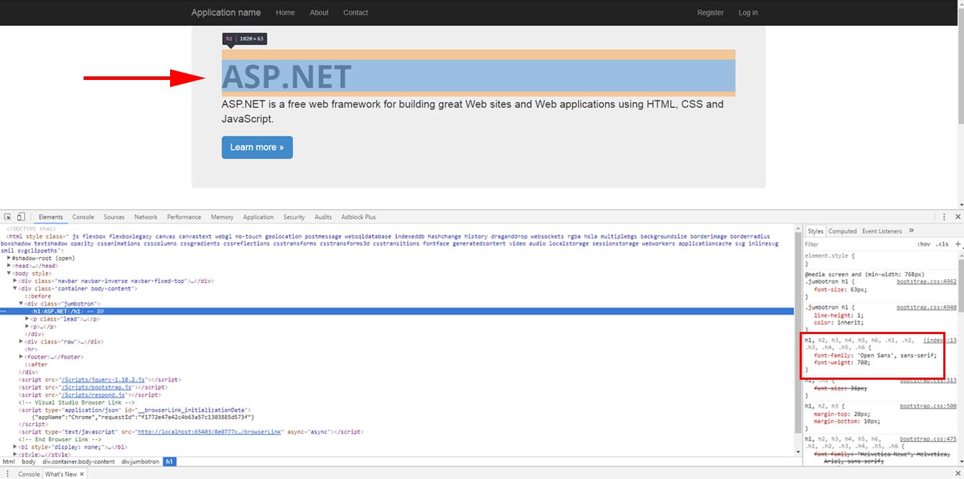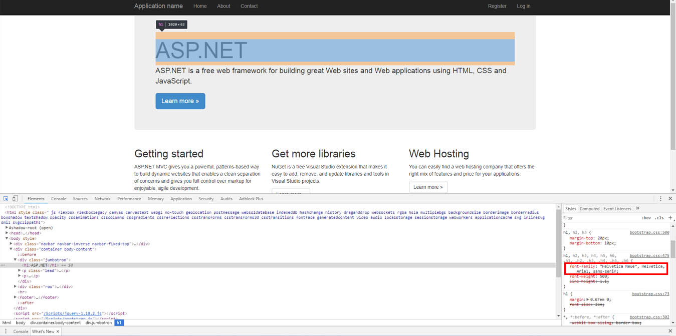 Artık Visual studio üzerinden yeni bir hazır MVC projesi açarak örneğimize başlayabiliriz. Oluşturduğunuz projeyi debug ederek kod yapısına Chrome DevTools yardımıyla bakarsanız taslakta h1 etiketi için “Helvetica Neue” font ailesinin kullanıldığını görebilirsiniz.