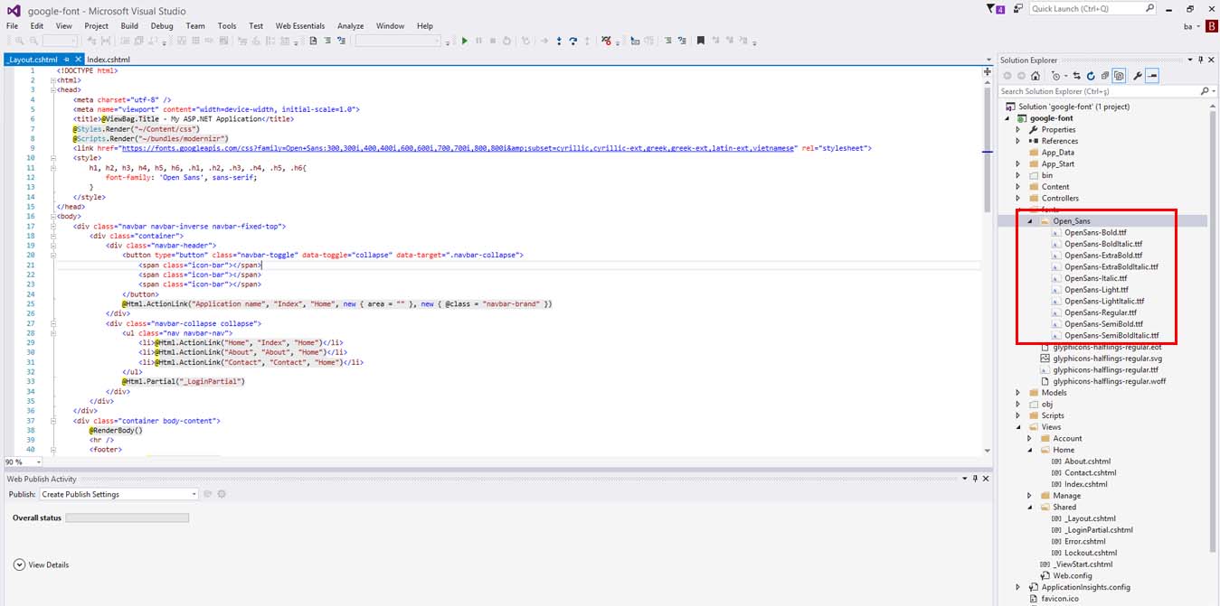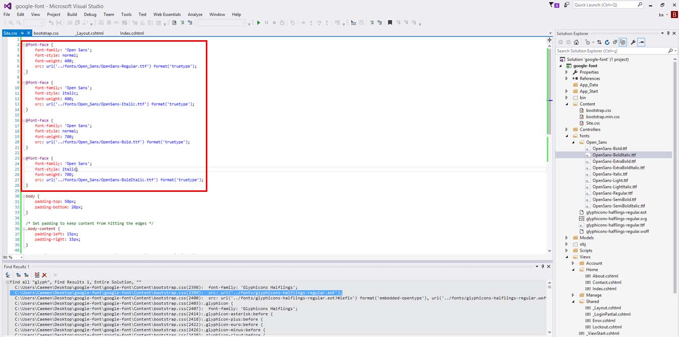 Zaten hazır MVC proje taslağı içerisinde bulunan fonts klasörüne tüm Open Sans fontlarını yüklüyoruz. Düzenli olması adına ben fonts klasörü altında tekrar bir klasör açarak kullanmayı tercih ettim, siz dilediğiniz gibi kullanabilirsiniz.