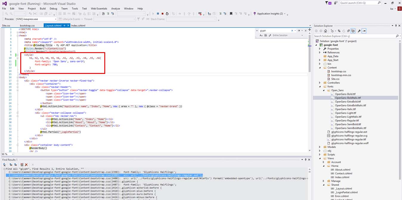 Hızlıca _Layout.cshtml dosyasına dönüp inline bir css ile (siz siz olun inline css'leri evinizde denemeyin :) ) H etiketlerine Open Sans fontunu tanımlıyor ve debug alarak fontun sorunsuz bir şekilde çalıştığını görüyorum.